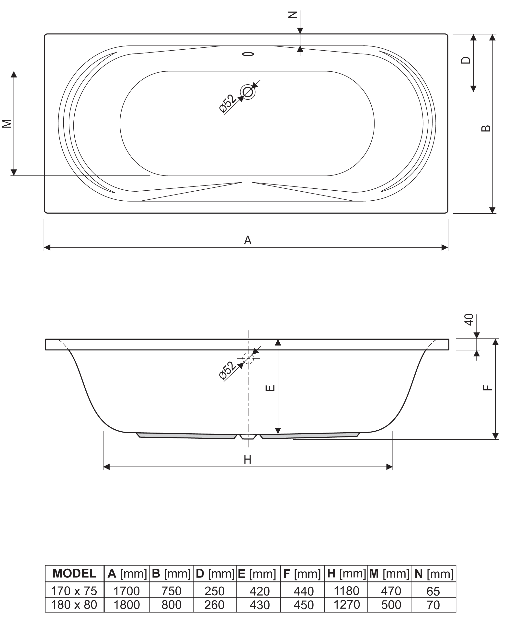 - 170 x 75 cm VOL: 180 ltr