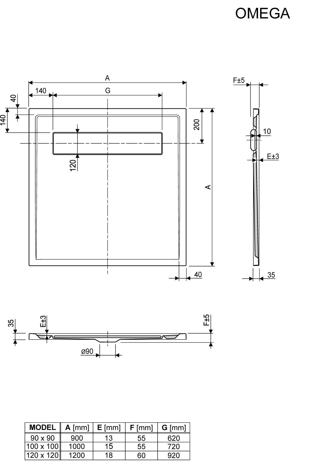 Square version of an ultra-flat shower tray Omega is intended for floor-level mounting. Its innovative and elegant design of acrylic outflow cover makes it an attractive choice for any bathroom.