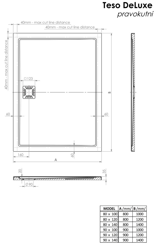 - Teso DeLuxe shower tray can be cut within certain dimensions. When ordering factory cutting, it is necessary to attach a sketch with marked cutting lines.