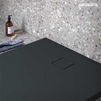 Stone DeLuxe mineral marble shower trays offer a solid and sophisticated surface that resembles concrete in white, beige, black or cement gray. An attractive siphon cover made in the same effect as the surface of the shower tray contributes to the characteristic appearance of Stone DeLuxe shower trays.