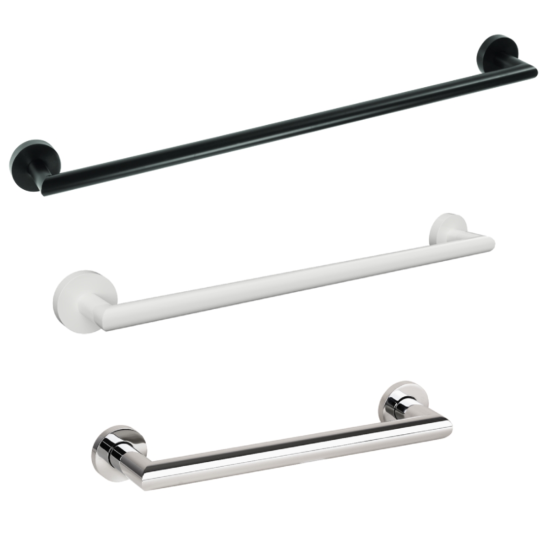 Elegantni i funkcionalni držač ručnika izrađen od mesinga u kromiranom (30 cm), bijelom mat (45 cm), ili crnom mat (50 cm) efektu.